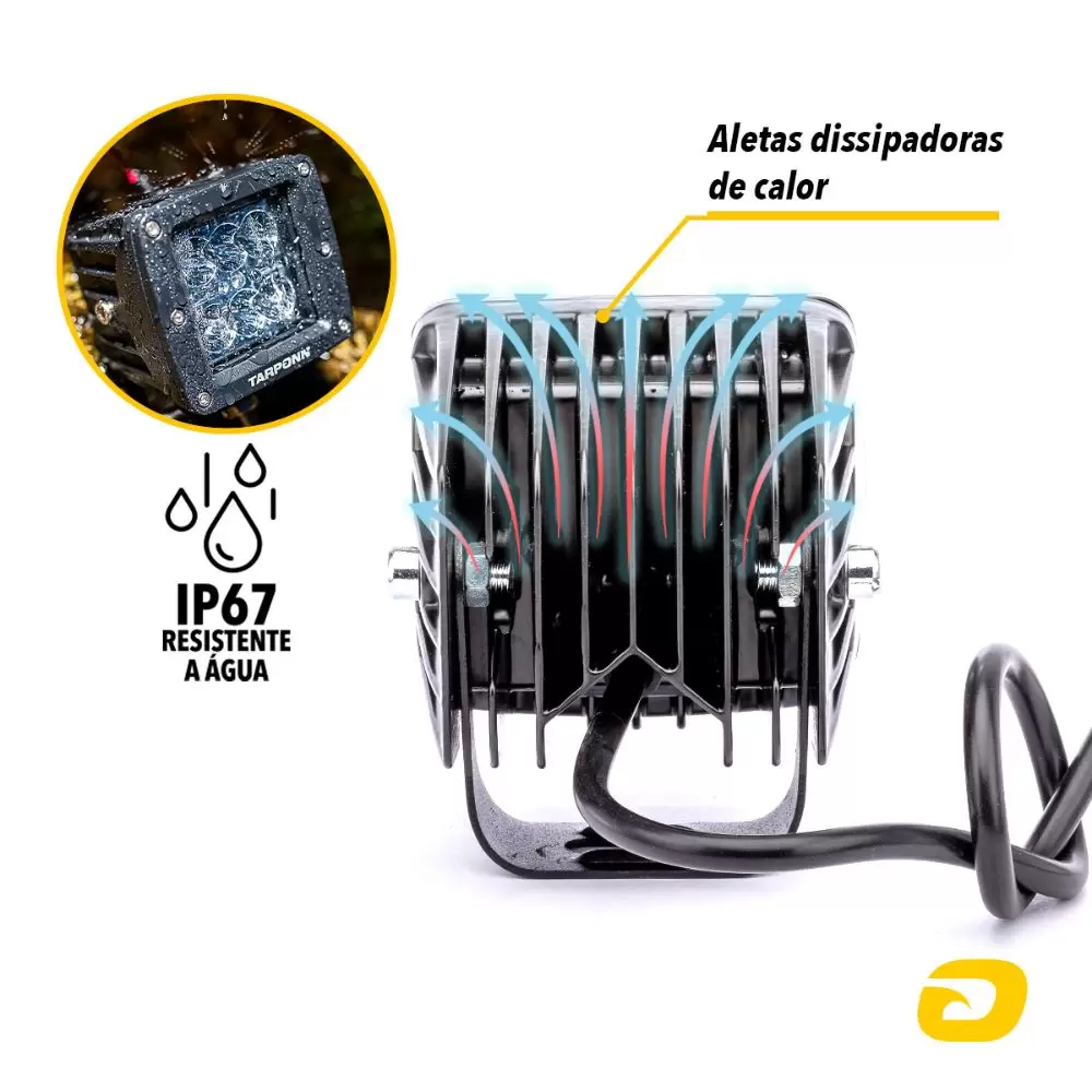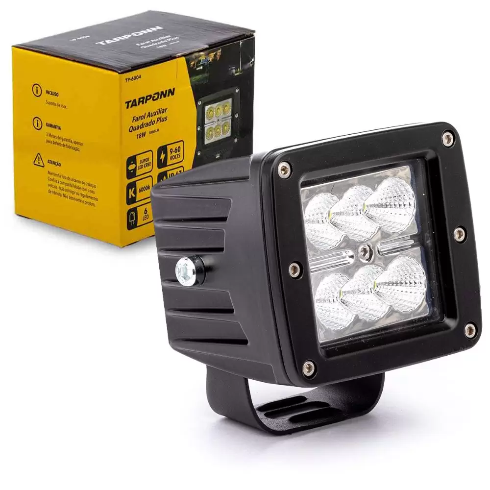 Modelo Quadrado Plus, compacto e fácil de instalar, o Farol Auxiliar TARPONN Quadrado 6 LEDs 18W 9~60V 6000K possui corpo de alumínio reforçado e acabamento de alta qualidade.