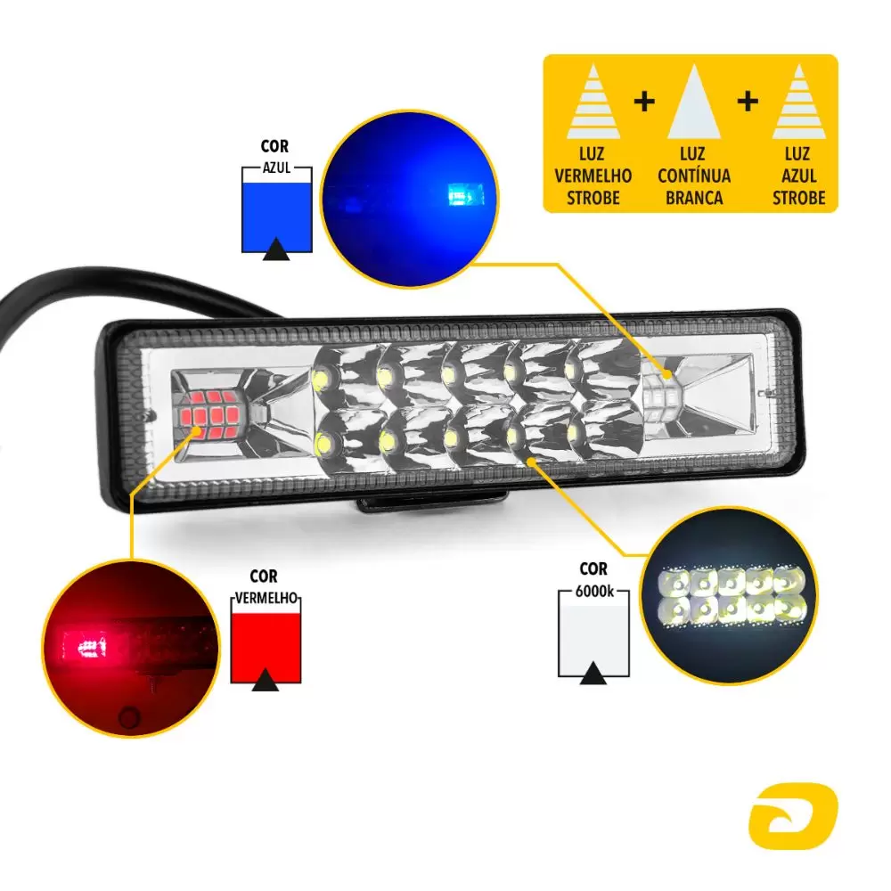 10 LEDs 6000k Centrais de Luz Contínua. LEDs laterais com a função Strobe, 3 LEDs SMD Azul e 3 LEDs SMD Vermelho