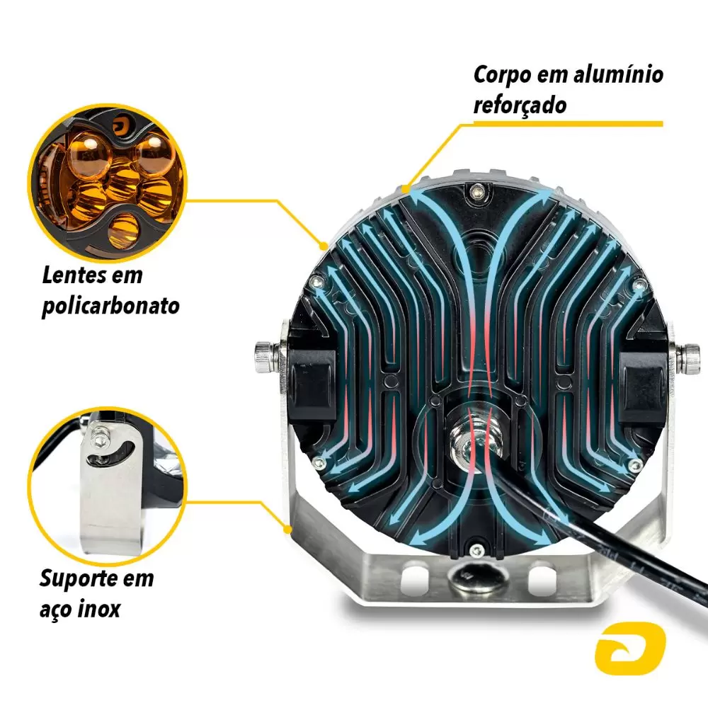 Certificado com IP68 à prova d'água, o farol enfrenta condições adversas sem problemas. Com dupla vedação para proteção contra umidade, poeira e sujeira, ele pode ser usado em uma variedade de veículos off-road. Possui suporte em aço inoxidável resistente e conector DT, para uma fixação segura.