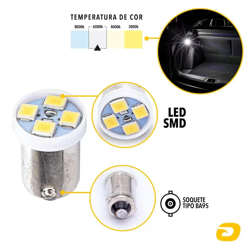 Possui receita 69/Ba9S e recomendada em locais de pouco espaço para sua instalação, sendo muito utilizada em placa e luz interna.