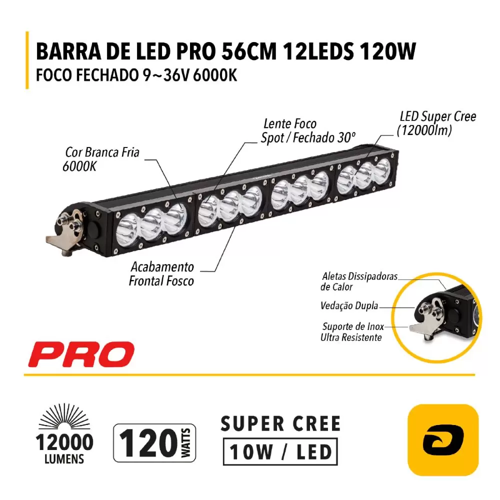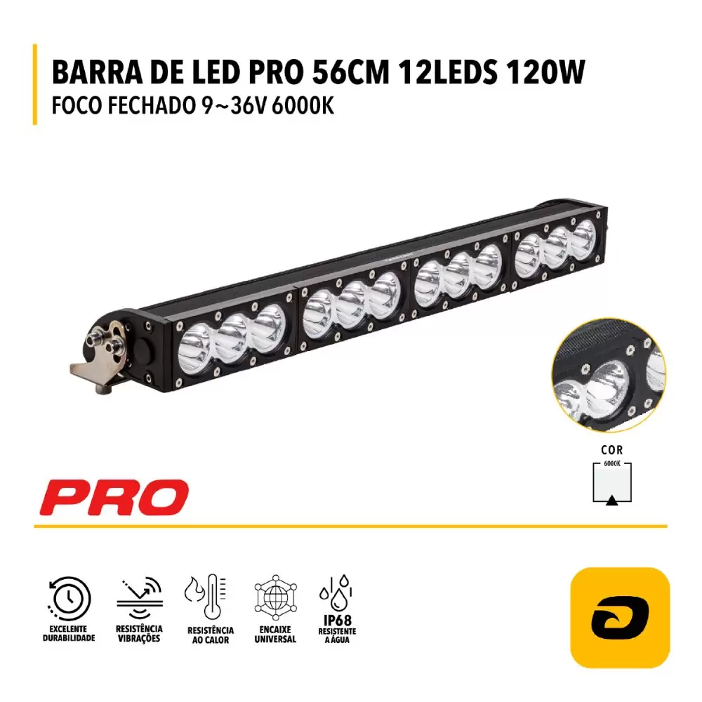 Adquira agora a BARRA DE LED PRO 56 CM 12 LEDs 120W FOCO FECHADO 9~36V BRANCO FRIO 6.000K e aproveite uma iluminação potente e duradoura em todas as suas aventuras!
