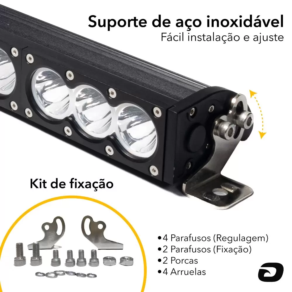 Com classificação de proteção IP68, oferece resistência à água, vibrações e calor protegendo contra corrosão e ferrugem, mesmo em condições extremas como lama, terra e barro. O acabamento fosco frontal e o suporte duplo, com laterais em aço ultra reforçado, garantem uma instalação segura e estável.