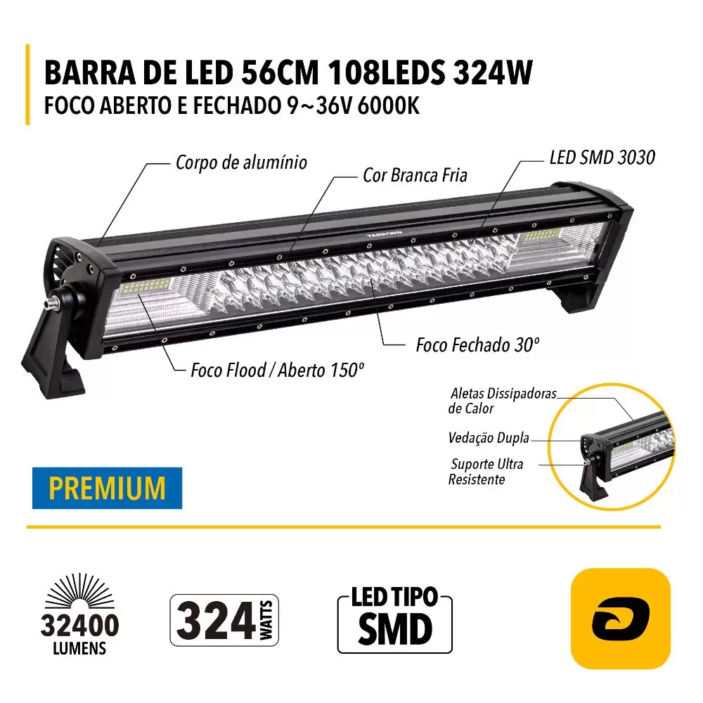 Não perca tempo, garanta agora a BARRA DE LED PREMIUM 56CM 108 LEDs 324W FOCO ABERTO E FECHADO 9~36V BRANCO FRIO 6.000K e tenha uma iluminação potente e duradoura em todas as suas aventuras!