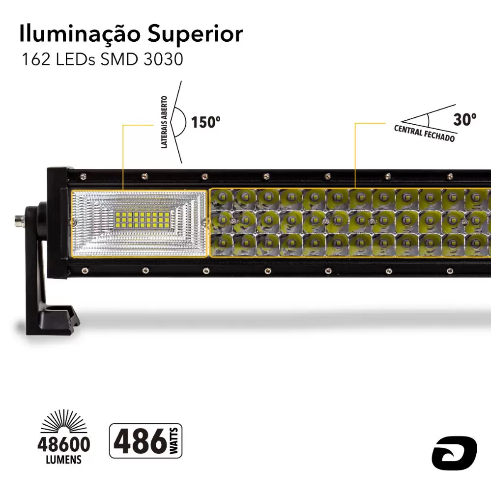 Esta barra conta com três linhas horizontais de LEDs na parte central, oferecendo um foco Fechado/Spot com uma abertura de 30°. Isso resulta em uma emissão de luz altamente concentrada, capaz de alcançar longas distâncias. Os LEDs laterais complementam com um Foco Aberto/Flood com uma abertura de 150°, garantindo uma visão ampla e lateral.