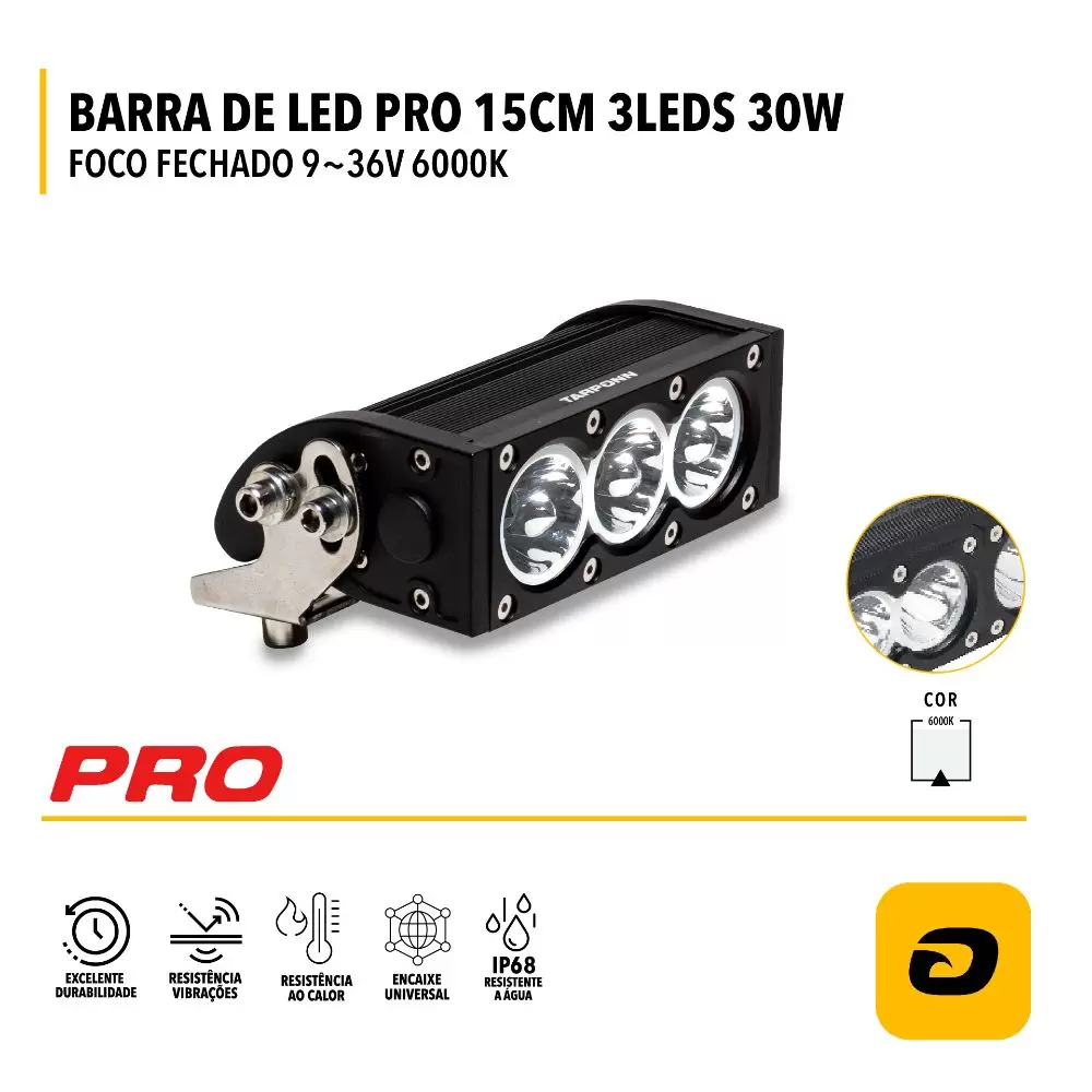 Quer personalizar a iluminação de seu veículo com versatilidade? BARRA DE LED PRO 15 CM 3 LEDs 30W FOCO FECHADO 9~36V BRANCO FRIO 6.000K da Tarponn oferece uma estrutura robusta de alumínio reforçado, garantindo durabilidade e resistência em todas as suas jornadas.