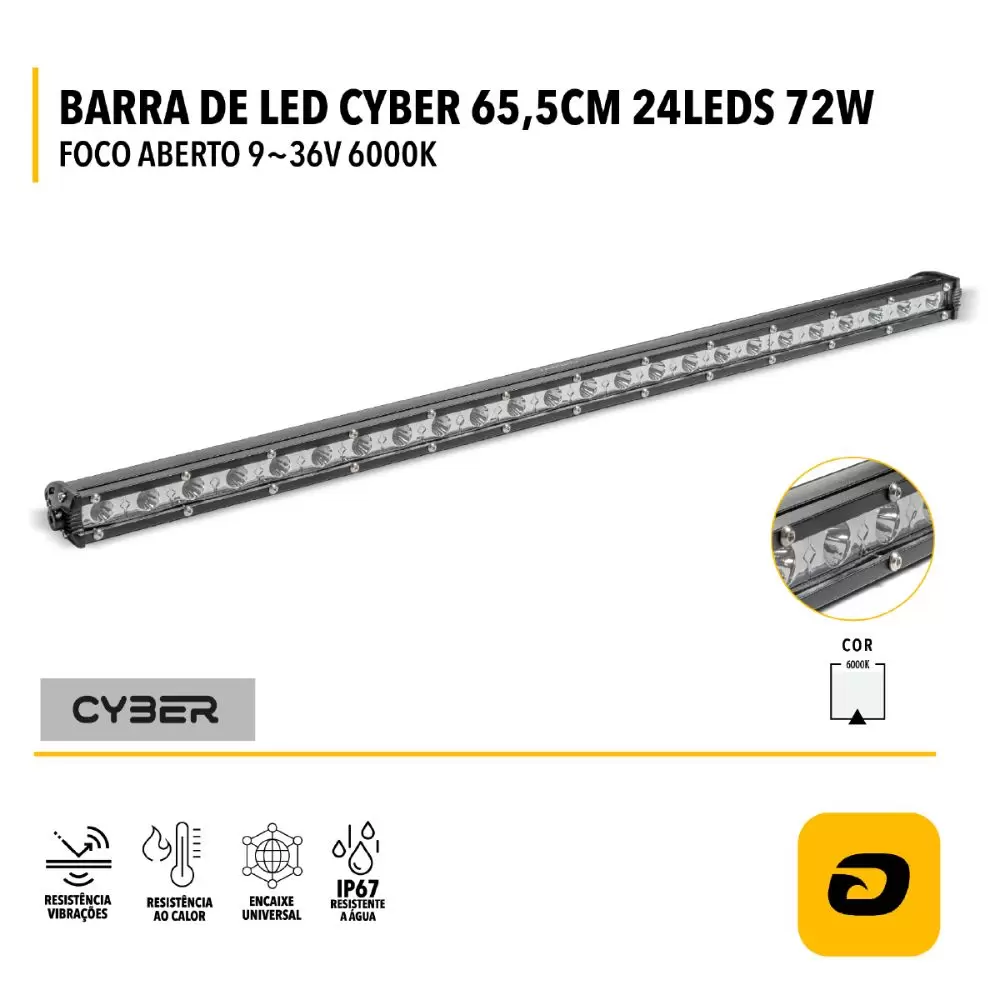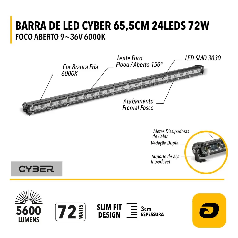 Não perca tempo, garanta agora a BARRA DE LED SLIM CYBER 65,5CM 24LEDS 72W FOCO ABERTO 9~36V BRANCO FRIO 6.000K e experimente uma iluminação potente e duradoura em todas as suas aventuras!