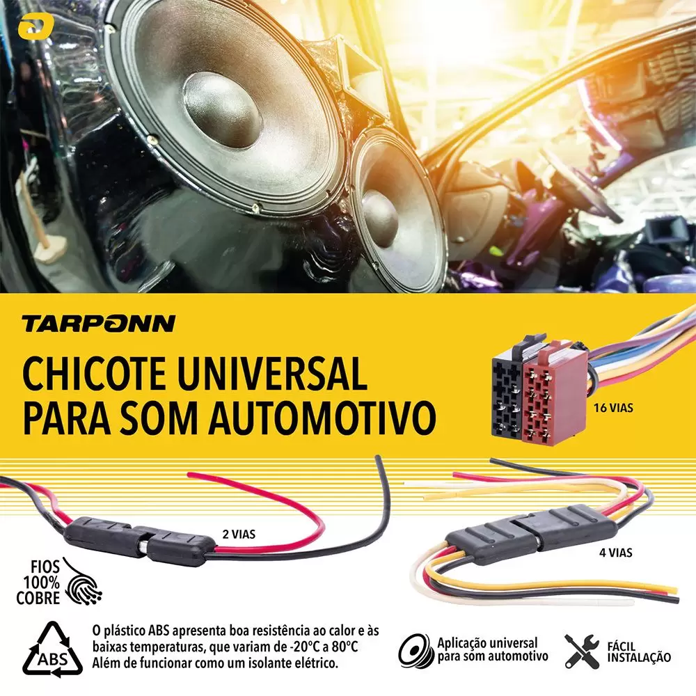 O Chicote universal de som Tarponn, com 4 vias (2020) é perfeito para a instalação de itens de som automotivo.