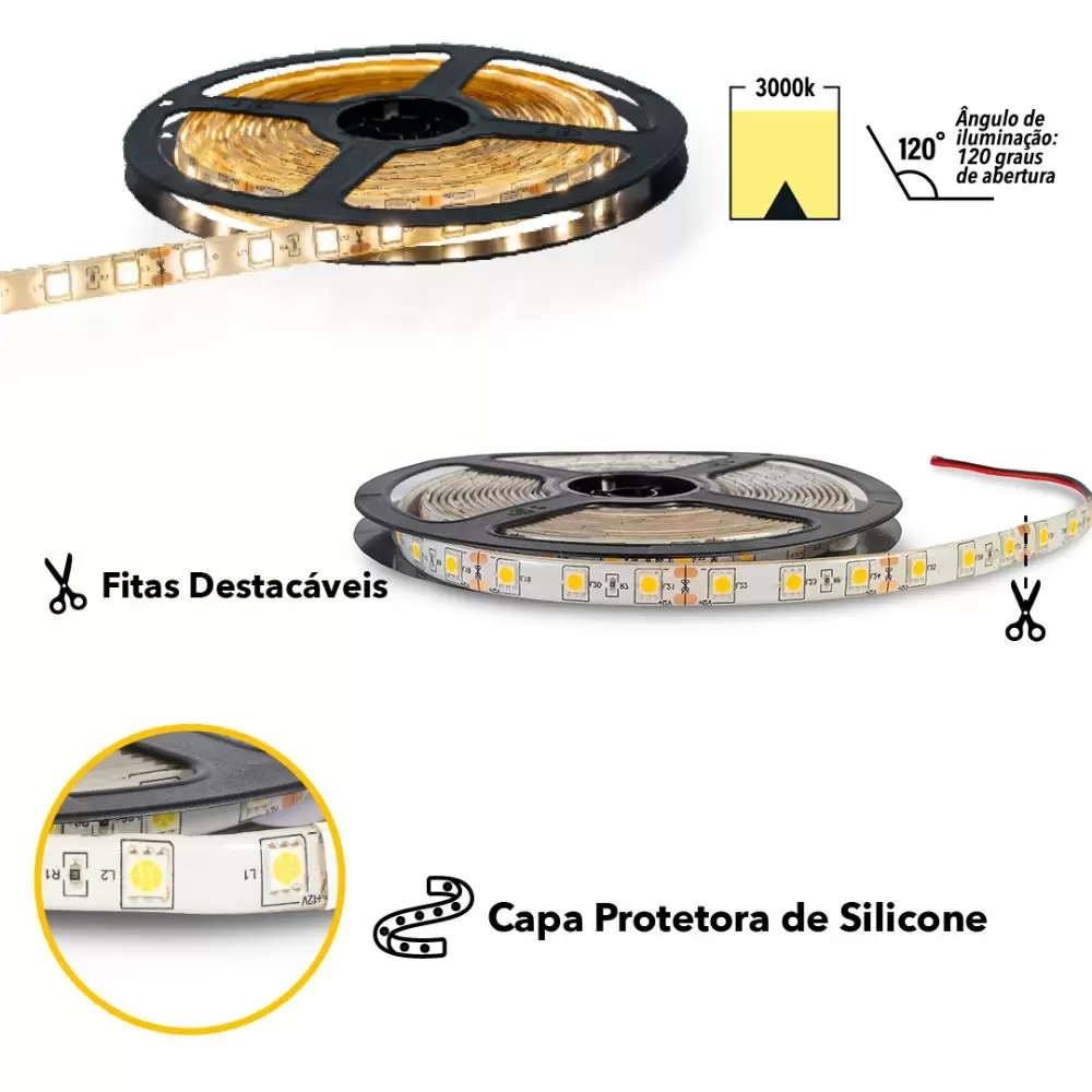 Fabricada com o LED SMD 5050, possui 05 metros e forte iluminação, sendo 14,4w de potência por metro de fita e um equipamento de iluminação em 120 graus.