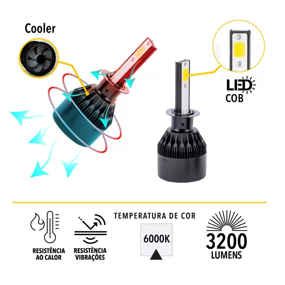 Aposto que você nunca viu nada igual no mercado! Com acabamento galvanizado, cromado e tecnologia COB, o Kit Lâmpada Tarponn Super LED Cyber H3 é perfeito para você!