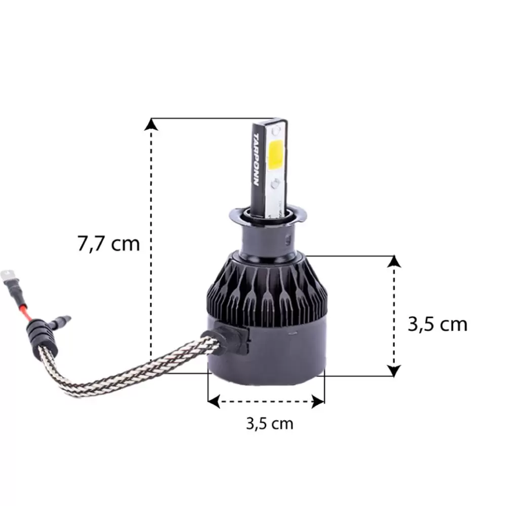 Fácil de instalar e bastante compacta, oferece maior eficiência energética, além de vida útil prolongada, efeito Xênon, Corpo de Liga de Alumínio e refrigerador integrado. Tudo o que você precisa, está no Kit Lâmpada Tarponn Super LED Cyber H3!
