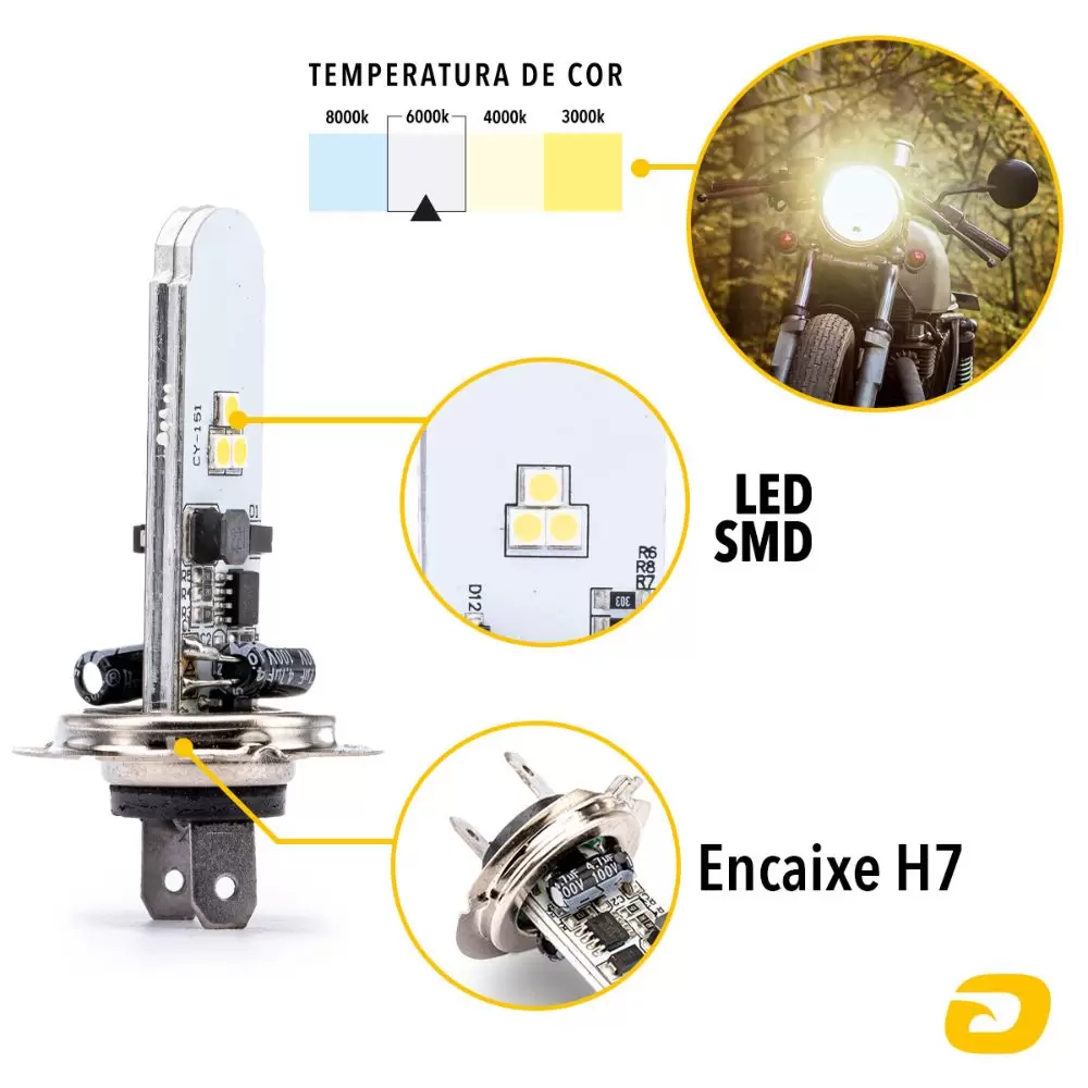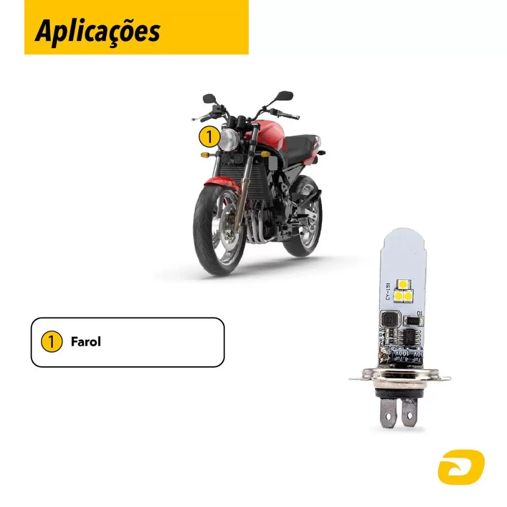 Com longa vida útil, possui consumo de energia e é recomendado para baixo uso em farol principal de motocicletas.