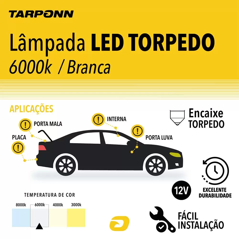 Sabia que as lâmpadas Torpedo Tarponn são muito aplicadas na iluminação de ambientes internos, como luz de teto, porta-malas, porta-luvas e placa? Vale destacar que é necessário verificar a compatibilidade do modelo de seu carro.