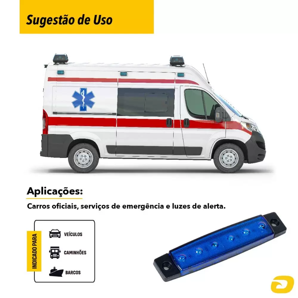 Compacta em suas dimensões e com um ótimo acabamento, a Lanterna Lateral 6 LEDs bivolt azul oferece tudo o que você precisa em uma lanterna lateral: alta qualidade, durabilidade, segurança, resistência e excelente luminosidade. Não perca mais tempo e adquira já a sua!